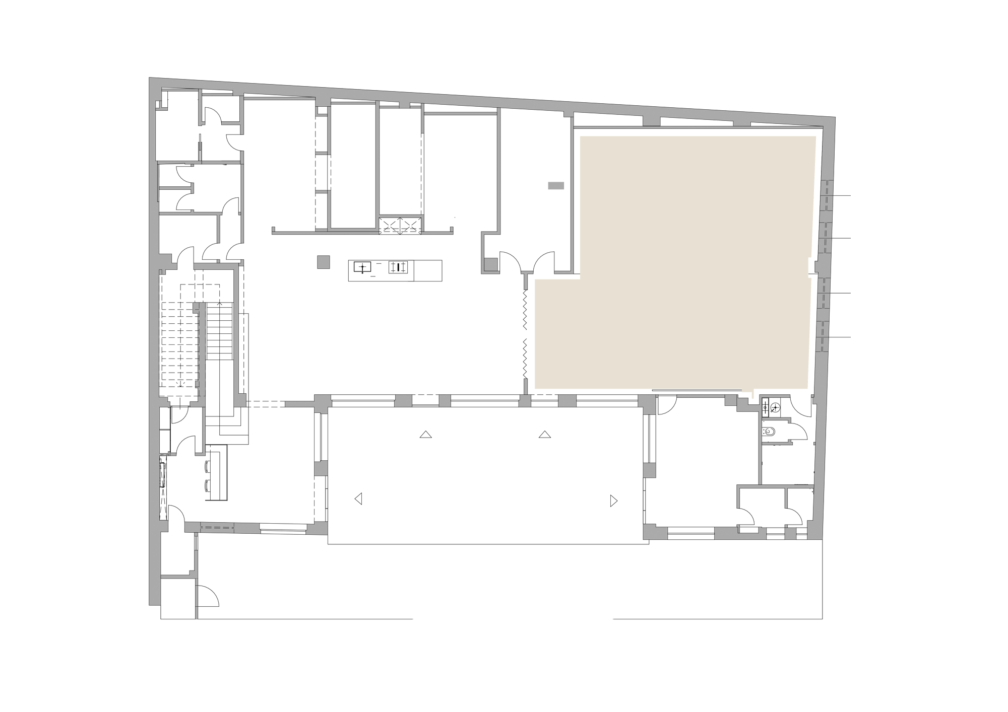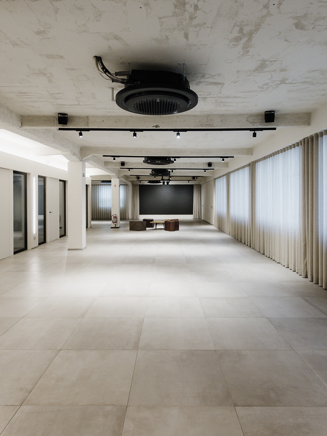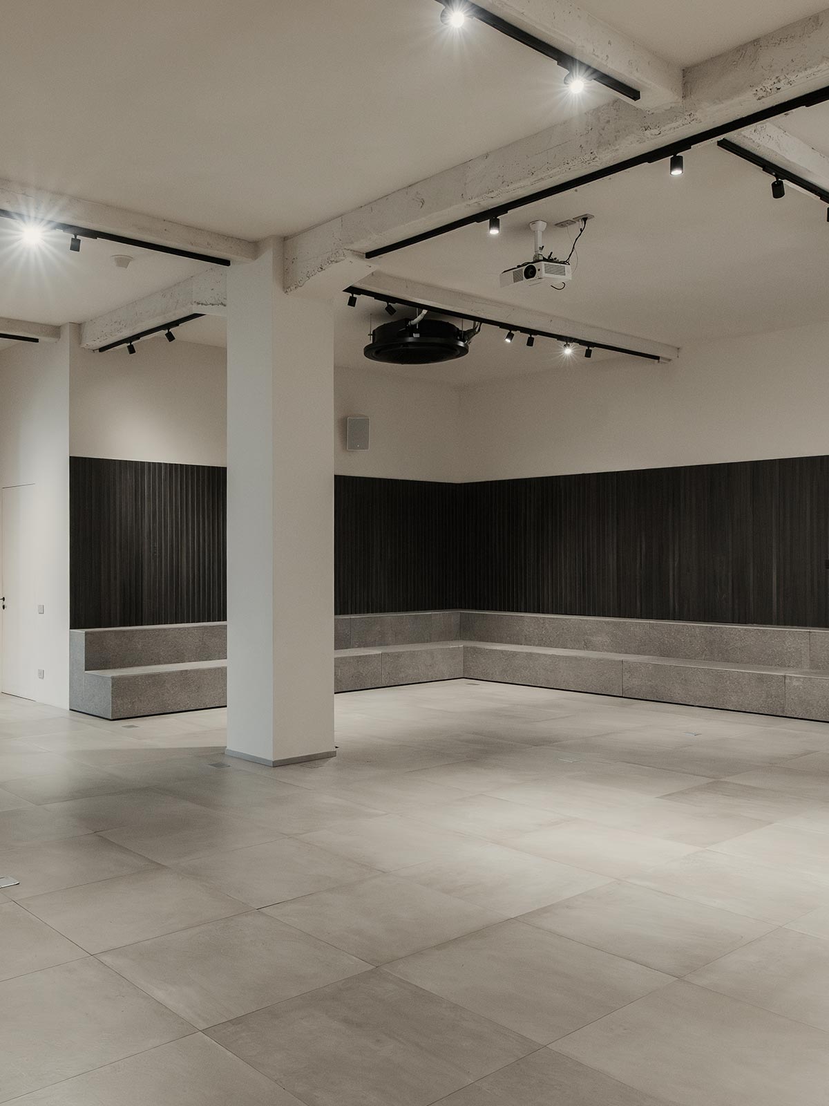 The ground floor houses the main open areas, ideal for installations, product showcases, or gatherings. Its flexible layout and natural light make it adaptable to different setups — from exhibitions and press presentations to private events.